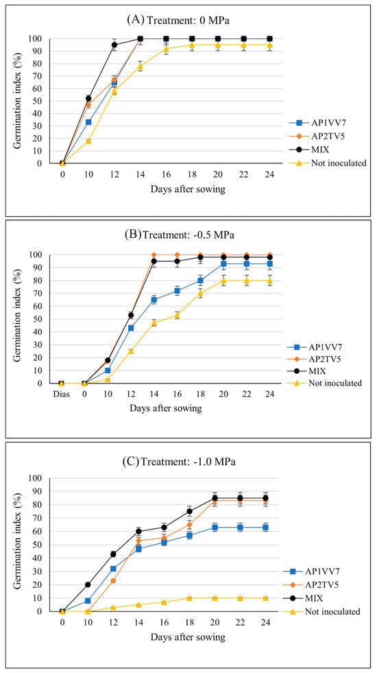 Germination index and speed of germination of seeds of E. oleracea Mart. non-inoculated and inoculated with strains B. proteolyticus (AP2TV5) and P. aryabhattai (AP1VV7), separately and in association, and subjected to different treatments with and without addition of PEG 6000: (A) without addition of PEG 6000 (0 MPa), (B) with addition of PEG 6000 (−0.5 MPa), and (C) with addition of PEG 6000 (−1.0 MPa). Each treatment had four repetitions with 15 seeds each, totaling 60 seeds per treatment.