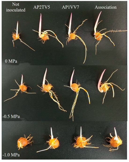 Evaluation of root growth parameters and seedling length also revealed that all PGPR-inoculated treatments had positive effects on the initial development of plants. Similar data were obtained by Ahmed et al. [45] when inoculating a drought-tolerant PGPR strain (Enterobacter sp./Leclercia adecarboxylata PAB19) in Vigna radiata (mung bean), resulting in a significant increase in root growth. Here, specifically, inoculation with the P. aryabhattai (AP1VV7) strain proved to be the most effective in promoting root growth under severe water deficiency conditions (−1.0 MPa), which may be related to the high potential of this strain to produce IAA.