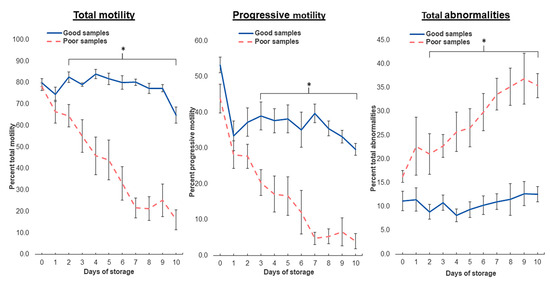 Evolution of boar sperm parameters of Good and Poor semen doses during cooled storage. Extended boar semen samples were stored at 17 °C for up to 10 days. * denote significant differences between Good and Poor within the same day of storage, p < 0.05.