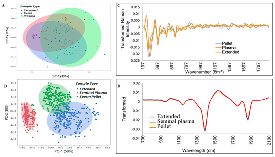 The NIR spectroscopy was better suited for sample type clustering, while Raman spectroscopy evidenced a superior ability to discriminate sample according to sperm quality (Good vs. Poor), emphasizing the potential use of Raman spectroscopy as a promising alternative technique for semen analysis, provided that an effective prediction model for sample classification is established. Of interest, the usage of Raman spectroscopy allowed us to confirm semen samples classification as Good or Poor semen quality from Day 0, which could enable rapid diagnosis of semen doses and contribute to their optimal management in breeding operations. For all sample types, the average Raman profile showed different intensities between the spectra of Day 0 and Day 7, with several peaks. These differences mainly were observed within the 600–1500 cm−1 range, corresponding to the vibration modes of proteins, nucleic acids, amino acids, carbohydrates, and lipids. This range belongs to the so-called fingerprint region of the entire Raman spectrum (400–1800 cm−1), where most of the hydrogen-bonded (i.e., C=O, C-C, and C-N) protein side groups and the protein backbone show absorbance bands [59,60]. Several peaks detected in this range have been associated with various regions of the sperm head (e.g., ~1094, ~1180, and ~1420 cm−1), mid-piece (e.g., ~743, ~1109, and ~1364 cm−1), and tail (e.g., ~1003, ~1288, and ~1607 cm−1) [61]. Focusing on the spectra of the Plasma sample type which exhibited negative peak differences, we hypothesized that various biochemical components of sperm were released into the medium during storage, leading to opposite spectral displays between Day 0 and Day 7.