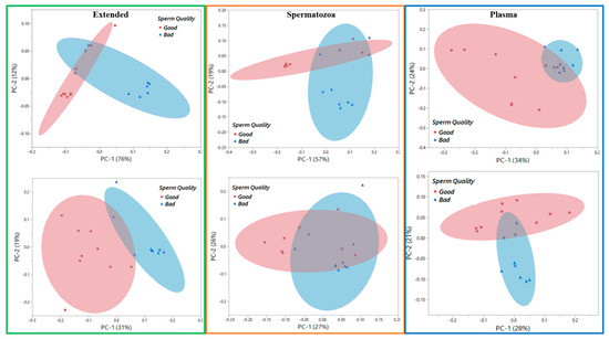 Principal component analysis score plots of Raman data of different sample types from boar semen. Raman spectra were collected on (upper panel) Day 0 and (bottom panel) Day 7 from Good and Bad/Poor semen doses.