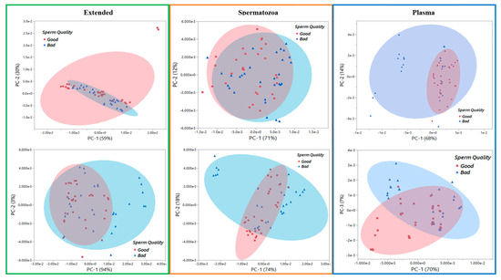 Raman spectroscopy showed potential to discriminate between Good and Poor semen doses from Day 0 with spectral shift changes in Extended (range of 266 cm−1 to 866 cm−1) and Spermatozoa (333 cm−1 and 666 cm−1) sample types mainly corresponding to the vibration modes of nucleic and amino acids. As for the Plasma type, the difference between spectra of Good and Poor samples was spread on a broader wavenumber range (250–2000 cm−1). This region corresponds to the spectral range of Raman detection of the major categories of biomolecules (proteins, carbohydrates, lipids, and derivatives), hence highlighting the abundance of Raman-sensitive molecules in the Plasma sample type. The transformed spectra revealed a similar pattern with all detected peaks, associated with known assigned wavenumbers of spermatozoa [19], being sample-type- and storage-time-dependent. It is therefore possible to envision that time-dependent identification of wavenumbers specific to each sample type may contribute to the development of biomarker candidates to enable the selection of robust and more resilient extended semen for well-planned cooled storage. Indeed, previous studies have shown the potential of Raman spectroscopy to detect damage to sperm DNA and mitochondria. For example, wavenumbers ~1420 and ~1612 cm−1 have been associated with sperm head damage following UV exposure [19] and semen manipulation [28], respectively, while wavenumbers 1050 and 1095 cm−1 were proposed as markers for monitoring oxidative damage in human sperm DNA [21]. In another study, wavenumbers ~ 751, ~788, and ~2850–3000 cm−1 helped to assess the mitochondrial status of sperm [30].