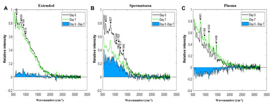 Average Raman spectra collected on Day 0 and Day 7 of boar semen storage: spectra from (A) Extended, (B) Spermatozoa, and (C) Plasma sample types were filtered out using the Savitzky–Golay filter (order 3 and frame length 23) and normalized to the highest spectral value from each sample group type.