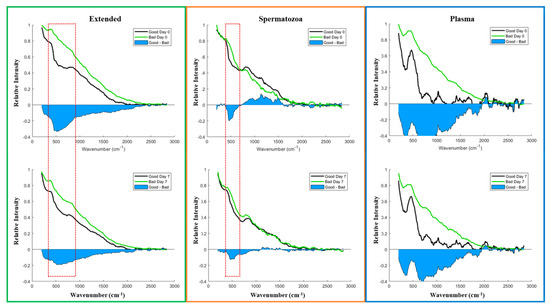 Transformed Raman spectra of different sample types from Good vs. Bad/Poor boar semen doses. Raman spectra were collected on (upper panel) Day 0 and (bottom panel) Day 7.