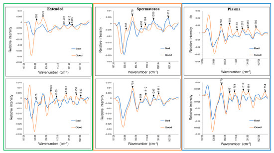 Most importantly, Raman spectroscopy could distinguish biochemical heterogeneities between Good and Poor semen doses. Both groups displayed distinct spectra on Day 0 and Day 7 of storage (Figure 7). Comparisons of both groups to detect likely pre-existing compounds on Day 0 revealed interesting Raman shift changes in the Extended (266–866 cm−1), Spermatozoa (333–666 cm−1), and Plasma (250–2500 cm−1) sample types (Figure 7). The same figure was observed on Day 7. The transformed spectra in Figure 8 accentuate the spectral response to chemical changes in samples on Day 0 and Day 7 and reveal several sample-type- and storage-time-dependent peaks (Table 3).