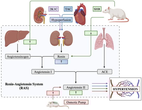 Here, we describe the spontaneously hypertensive rat (SHR), an inbred strain of the Wistar Kyoto rat and the high blood pressure (BPH/2) mouse model, both selected for high blood pressure phenotypes. The SHR model gradually develops severe hypertension by 2 to 4 months of age, with blood pressure stabilizing by six months [292]. While the full genetic basis of the development of hypertension in the SHR model is still debated due to its complex polygenic nature, most researchers agree there is some manipulation of the genes related to the RAS [293,294]. Additionally, while considered a low-renin model of hypertension, the SHR model demonstrates increased angiotensinogen production, subsequently increasing circulating angiotensin II [295] (Figure 1). The BPH/2 mouse model demonstrates increased systolic blood pressure compared to their normotensive counterpart (Blood Pressure Normal—BPN/3J) by three months of age [296], partly due to neurogenic mechanisms controlling renal renin secretion [297].