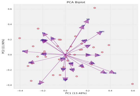 The data were analyzed statistically using a procedure appropriate for randomized complete block design (RCBD) with split plot arrangement using statistical software Statistix 8 [35]. The means were compared using LSD when the F test was found significant [36]. Moreover, a Pearson correlation was also applied to check the correlation among the studied attributes, following a procedure conducted by Schober et al. [37]. A principal component analysis was also performed using a procedure conducted by Greenacre et al. [38].