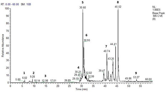 The mass spectrometry analysis of the phytochemical profile of HEVe revealed the presence of phenolic acids, neolignans, flavonoids, and monomeric catechins (Figure 1). Compound identification was achieved by comparing the fragmentation patterns with data from the literature [19,29,30,31]. The UHPLC-MS chromatogram of the extract revealed several compounds: (1) quinic acid, (2) resveratrol, (3) 3′,4′-dimethoxy-3,4-methylenedioxy-6 7′,8 8′-neolignan, (4) quercetin, (5) catechin dimer, (6) diglycosyl-flavonoid (C-glycoside), (7) catechin trimer, (8) catechin tetramer, and (9) catechin pentamer (see attached Supplementary Materials Figures S1–S9) Table 1 details these compounds.