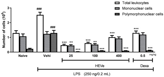 The injection of LPS into the mice in the vehicle group did not induce changes in the number of mononuclear (MN) cells compared to the naive group. However, the oral administration of HEVe at doses of 25 and 100 mg/kg reduced the number of MN cells by 64.3% and 58.0% (p < 0.01), respectively, compared to the vehicle group (Figure 2).