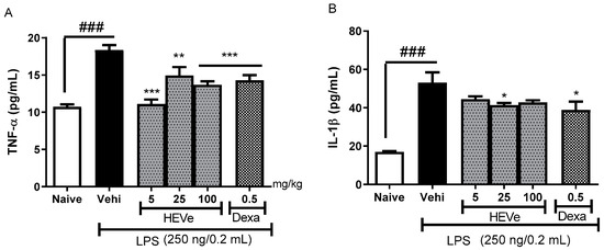 Effect of oral administration of the vehicle (Vehi 0.1 mL/10 g of distilled water), hydroethanolic extract from the inner stem bark of Virola elongata (HEVe 5, 25, and 100 mg/kg), and dexamethasone (Dexa 0.5 mg/kg) on the concentrations of (A) tumor necrosis factor-alpha (TNF-α) and (B) interleukin-1 beta (IL-1β) in the peritoneal lavage of mice with peritonitis induced by intraperitoneal injection of LPS (250 ng/well/0.2 mL). The naive group received distilled water (0.1 mL/10 g p.o.) and 0.9% saline (0.2 mL/well i.p.). Each column represents the mean ± SE of eight animals/group. One-way ANOVA, followed by the Student–Newman–Keuls test, * p < 0.05 vs. Vehi, ** p < 0.01 vs. Vehi, *** p < 0.001 vs. Vehi, ### p < 0.001 vs. naive.