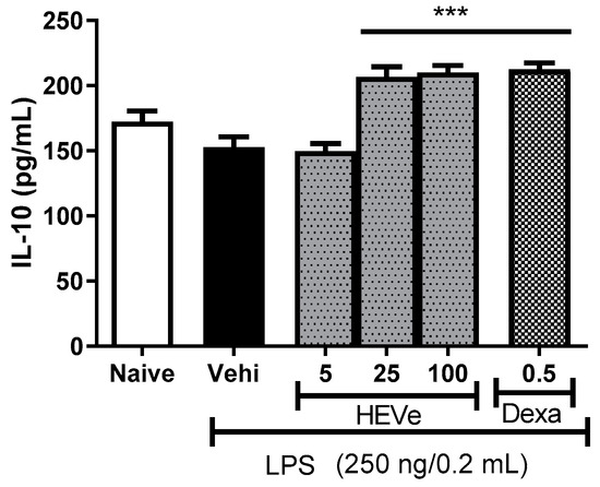 The animals with LPS-induced peritonitis did not demonstrate a significant difference in the determination of the anti-inflammatory cytokine IL-10 compared to the naive group. Treatment with HEVe at doses of 25 and 100 mg/kg increased the levels of this cytokine in peritoneal lavage by 35.5% and 37.7%, respectively (p < 0.001), compared to the vehicle group. Dexamethasone (0.5 mg/kg), a positive control, increased IL-10 levels by 39.1% (p < 0.001) (Figure 4).