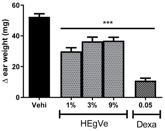 Topical dermatitis [25] was used to evaluate the potential local anti-inflammatory effect of HEgVe. The inner surfaces of both ears of mice (n = 8/group) were topically treated with either vehicle (Natrosol® gel), HEgVe (at concentrations of 1%, 3%, and 9%), or 0.25% dexamethasone (0.05 mg/ear/20 µL). After 25 min, 20 µL of croton oil (2.5% in acetone:water, 7:3 v/v) were applied to the left ear of each animal, while 20 µL of acetone:water (7:3 v/v) were applied to the right ear, serving as a control. Six hours after the administration of the inflammatory stimulus, the animals were euthanized with an anesthetic overdose of xylazine (30 mg/kg) and ketamine (300 mg/kg) intraperitoneally (i.p.), and both ears were excised at the base and weighed individually. Topical inflammation was assessed by the local edema formed, calculated by the differences in weight (Δ mg) between the left (inflamed) and right (uninflamed) ear.