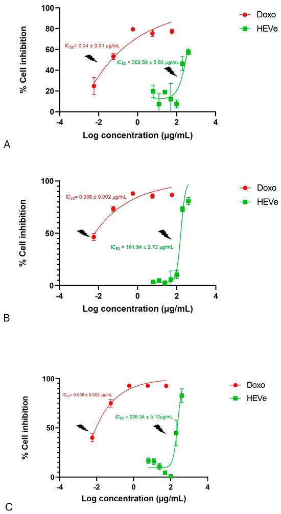 Cytotoxicity assessment of the hydroethanolic extract from the bark of the stem of Virola elongata (HEVe 6.25–400 µg/mL) and doxorubicin (Doxo 0.0058–58 µg/mL in RAW 264.7 cells stimulated with lipopolysaccharide (LPS 1 µg/mL) for 24 (A), 48 (B), and 72 h (C). Inhibitory concentration at 50% (IC50 ± S.E.). Nonlinear regression analysis (curve fitting).