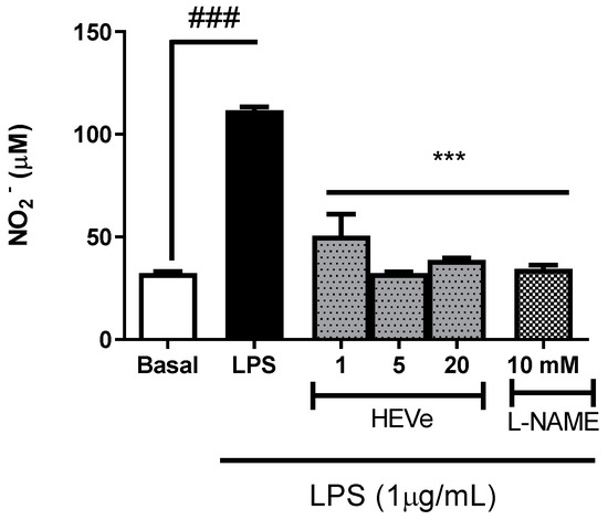 NO production was determined by the quantity of nitrite (NO2−), which was calculated using the colorimetric method based on the Griess reaction [28]. RAW 264.7 cells were treated with three concentrations of HEVe (1, 5, and 20 µg/mL) and Nω-Nitro-L-arginine-methyl-ester (L-NAME, 10 mM). Cells were also maintained with only the culture medium and no phenol red (for basal control). After 1 h, they were stimulated with LPS (1 µg/mL), except for the basal group. After 24 h in the oven, the supernatant was collected (100 µL) after 30 min in the centrifuge at 15,000× g and incubated with an equal volume of Griess reagent (1% sulfanilamide, 0.1% N-(1-naphthyl)-ethylenediamine dihydrochloride, 2.5% H3PO4) in another 96-well culture plate for 15 min at room temperature. The absorbance (540 nm) was measured in an automatic microplate reader, and nitrite concentrations were calculated by extrapolation to a sodium nitrite (NaNO2) standard curve, with data expressed in μM.
