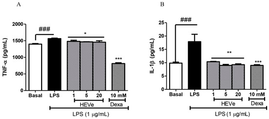 The levels of the pro-inflammatory cytokine TNF-α in the RAW 264.7 cells increased by 11.87% (p < 0.001) in the LPS group (1 µg/mL) compared to the basal group. The treatment with HEVe at 1, 5, and 20 µg/mL concentrations reduced the TNF-α levels by 5.3%, 6.3%, and 7.0%, respectively (p < 0.05), compared to the cells treated only with LPS. Dexamethasone (10 mM), the positive control, reduced TNF-α levels by 48.09% compared to the LPS-treated group (p < 0.001) (Figure 8A).