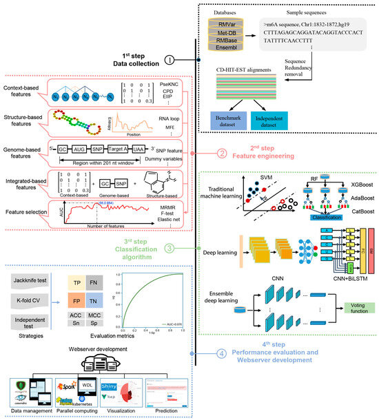 A graphical illustration of four common steps in the construction and evaluation of computational approaches for the prediction of m6A sites.