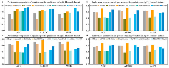 We collected m6A site sequences for nine species, as depicted in Table 3, and conducted a series of experiments to evaluate the performance of species-specific predictors. First, we utilized independent m6A data from four different sources of H. sapiens to evaluate the generalization performance of the existing species-specific predictors available, including DeepM6ASeq, HMpre, bCNN, m6AGE, m6A-NeuralTool, MultiRM, TL-Methy, and MASS. The results, shown in Figure 2, indicate that the predictor DeepM6ASeq demonstrates outstanding predictive performance on independent datasets from different sources. On the hg19_Human2 dataset, DeepM6ASeq achieves an ACC of 70.92% and an AUROC of 0.7211, surpassing the second-best predictor, MASS, by 3.5% and 7.36%, respectively. Additionally, its AUPR is 0.6663, exceeding the second-best predictor, m6AGE, by 4.41%. On the hg19_Human3 and hg9_Human4 datasets, the ACC, AUROC, and AUPR of DeepM6ASeq are all higher than those of the other predictors, while its performance on the hg19_Human1 dataset is also comparable to that of the other predictors. Furthermore, as seen from Figure 2, MultiRM and MASS also exhibit stable predictive performance in predicting the m6A sites of H. sapiens.