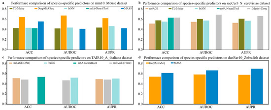 Next, we compared the prediction performance of species-specific predictors on independent datasets of M. musculus, S. cerevisiae, A. thaliana, and Zebrafish. As shown in Figure 3a, among the available species-specific predictors for the prediction of the m6A sites of M. musculus, DeepM6ASeq achieves the best predictive performance, followed by MASS. It can be seen from Figure 3b that iMethy-Deep demonstrates the most superior performance for m6A site prediction on the independent dataset sacCer3_S_cerevisiae of S. cerevisiae. The results depicted in Figure 3c suggest that the available species-specific predictors, such as m6AGE (25nt), m6AGE (101nt), bCNN, and m6A-NeuralTool, exhibit comparable prediction performance in predicting the m6A sites of A. thaliana. Additionally, on the independent dataset danRer10_Zebrafish, the species-specific predictor MASS exhibits slightly higher values for the ACC, AUROC, and AUPR compared to another predictor, DeepM6ASeq (Figure 3d).