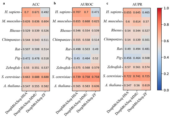 Cross-species performance comparison of DeepM6ASeq predictor on independent datasets of 9 species. (a–c) respectively show the values for ACC, AUROC, and AUPR.