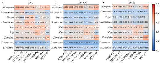 Cross-species performance comparison of MASS predictor on independent datasets of 9 species. (a–c) respectively show the values for ACC, AUROC, and AUPR.
