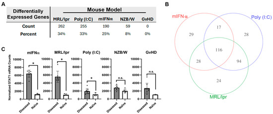 Analysis of autoimmunity- and inflammation-associated mRNA expression in kidney tissue harvested from animal models of SLE/LN. (A) DEGs in each animal model reported as both total count and percentage of all genes measured. (B) Venn diagram of significant genes identified in the mIFNα, poly (I:C) and MRL/lpr animal models of SLE/LN. Significance was determined using one-way ANOVA model at significance cutoff of adjusted p-value of 0.1 and at least 1.5-fold change between diseased and naïve mice. (C) Differential expression of Stat1 mRNA between diseased and naïve mice for each animal model. Asterisks indicate significant differences. Bars indicate mean +/− standard deviation.