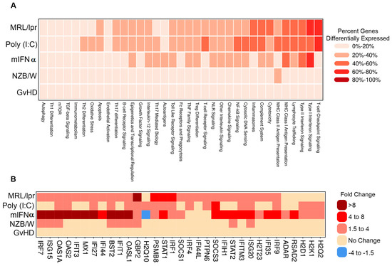 Pathway analysis of DEGs in animal models of SLE/LN. (A) Heatmap of modulated pathways (columns) for each animal model (rows). Colors binned by number of DEGs as a percentage of total genes for each pathway. (B) Heatmap of selected individual gene expression changes (columns) for genes in the Type I interferon signaling pathway, for each animal model (rows). Colors binned by fold changes (diseased vs. naïve mice) for each gene.