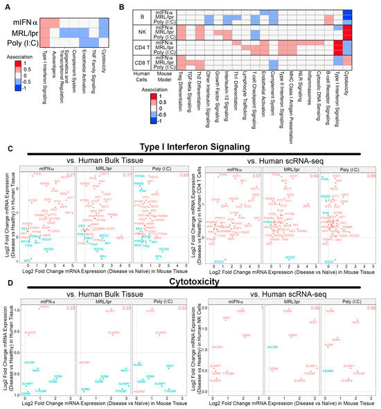 To further understand how well the animal models recapitulate SLE human disease features, DEGs from human SLE patient bulk kidney tissue and single-cell RNA sequencing (scRNA-seq) were associated with the gene expression profiles of each animal model (i.e., when human gene expression increases concordantly with animal gene expression, and vice versa) [5,28]. The MRL/lpr, poly (I:C), and mIFNα models exhibited significant DEGs compared to naïve controls, while the GvHD and spontaneous NZB/W models did not and were omitted from this analysis. When DEGs from human bulk kidney tissue were used, only moderate associations were observed, which were strongest for Type I interferon signaling (Figure 3A). However, when DEGs from human scRNA-seq were assessed, gene changes in subsets of human cell types showed markedly improved associations with gene changes in animal model tissue. For example, cytotoxicity pathway gene changes in SLE human NK cells showed a striking association with DEGs identified in kidney tissue from the MRL/lpr, poly (I:C) and mIFNα models. Similarly, changes in Type I interferon signaling pathway genes in SLE human CD4+ T cells showed strong associations with each animal model (Figure 3B). Notably, T cell-checkpoint-signaling DEGs in SLE human CD4+ T cells as well as B cell-receptor-signaling DEGs in SLE human B cells were positively associated with gene changes observed in the poly (I:C) and MRL/lpr models, but there was no association with gene changes in the mIFNα model (Figure 3B). Genes in the Type I interferon signaling pathway showed 0.77 (27/35) proportional association between the MRL/lpr model and human bulk kidney tissue, which increased to 0.94 (32/34) proportional association for human CD4+ T cells from scRNA-seq (Figure 3C). Similarly, genes in the cytotoxicity pathway showed 0.22 (2/9) proportional association between the mIFNα model and human bulk kidney tissue, which increased to 1.0 (8/8) proportional association for human NK cells from scRNA-seq (Figure 3D). These findings indicate that scRNA-seq may be more useful than bulk tissue gene expression changes for comparing specific disease pathways between species, especially when cell-type subsets are anticipated to contribute the majority of signaling for a given pathway in these models. Lastly, there were common pathways (NK cytotoxicity and CD4 IFN-I responses) amongst all three models compared to human disease while the MRL/lpr and poly (I:C) models engaged adaptive immune response pathways (B cell BRC and CD4+ T cell checkpoint signaling) in common with human SLE. These results may help provide a roadmap to identify appropriate SLE/LN mouse models to employ when targeting a specific pathway of interest.