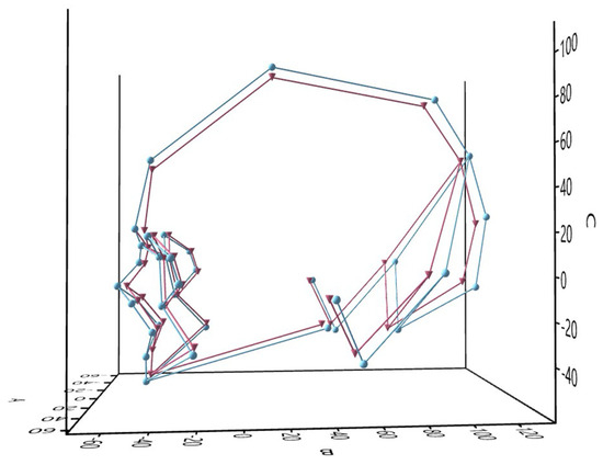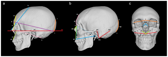 Thirty-six angles were calculated based on the 3D coordinates of the cranial landmarks (Table 2). Two types of angles were computed: between a line and a plane and between two lines (Figure 1, Supplementary File S1). Twenty (14 midsagittal and 3 bilateral) angles referred to the first type, which was calculated based on the direction vector of the line and the normal vector of the plane i.e., the arccosine of the ratio of the dot product of the two vectors to the product of their magnitudes. The plane in all these cases represented the Frankfurt horizontal plane (FH) built between the landmarks left orbitale, left porion, and right porion. The other sixteen (9 midsagittal, 5 transversal, and 1 bilateral) angles represented the second type of angles. The calculation of these angles was based on the Law of Cosines and the sides’ lengths of the triangle constructed for each set of three landmarks. The triangle’s sides were calculated as interlandmark distances in PAST, version 2.17c [23]. The computation of the angles was performed in MATLAB 2018a and MS Excel 2010.