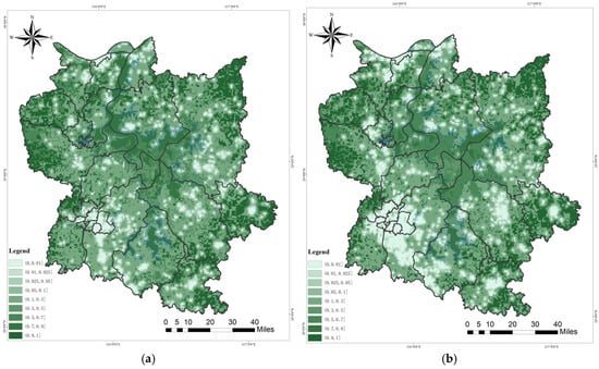 The land use data utilized in this study encompass two time periods, namely, 2000 and 2020. The remote sensing images for these datasets were obtained from the Landsat TM/ETM+/OLI images publicly accessible through the Geospatial Data Cloud of the Computer Network Information Center at the Chinese Academy of Sciences (https://www.gscloud.cn/, accessed on 1 August 2024). These images exhibit consistent spectral bands, strip numbers, and row numbers, with imaging conducted between June and September of each respective year to ensure minimal cloud cover and facilitate accurate identification of ground objects. Following processing using ENVI 5.3 software, the image coordinates were standardized to the GCS_WGS_1984 reference system. The support vector machine classification (SVM) method was employed along with interactive human–computer interpretation to extract original spatial distribution maps depicting land use for both time periods [71,72]. Subsequently, post-classification processes including clustering and filtering techniques were applied to derive land use/cover change (LUCC) data for both time periods, whose resolution is 1000×1000 (Figure A1).