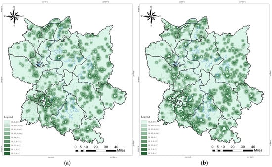 In the equation, Qxj represents the habitat quality of grid x in land use type j. Hxj denotes the habitat suitability of grid x in land type j. Dxj quantifies the degree of habitat degradation for grid x in land type j. k is defined as the semi-saturation constant, which is set to half of the maximum value representing habitat degradation after running the model once. z serves as a normalization constant, with a default value of 2.5 [76]. The habitat quality value ranges from 0 to 1, with a higher Qxj value indicating superior habitat quality. Yr is the number of threat factor rasters; wr is the proportion of threat factors. R is the number of threat factors; ry, irxy, βx and Sjr were the intensity of threat factors, the influence on habitat quality, the influence on policy, and the sensitivity of land class j to stress factor r, respectively. Considering the existing landscape pattern and previous research conducted in the Poyang Lake Migratory Bird Protection Area [59,76,77], combined with the field situation in the study area, threat factors were identified as arable land, urban areas, rural settlements, and other construction lands that experience significant disturbances caused by human activities. The distance algorithm between habitat rasters and threat is shown in Formulas (3) and (4) [78]: