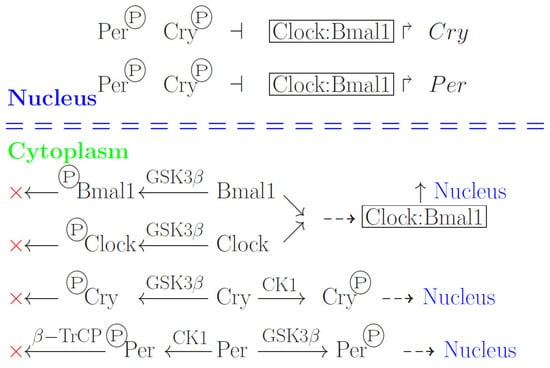 Molecular mechanism of circadian rhythms. The processes going on in the nucleus are shown at the top, and the processes in the cytoplasm are shown at the bottom. Dashed lines with arrows, translocation of the corresponding proteins into the nucleus; solid lines with arrows, direct effect, including catalysis; solid line with a blunt end, inhibition; circle with letter “P”, phosphate groups attached to the proteins; broken arrows, promoters; the diagonal crosses indicate protein degradation. Bmal1, basic helix-loop-helix ARNT like 1; CK1, casein kinase 1; Clock, circadian locomotor output cycles kaput protein; Cry, cryptochrome protein; GSK3, glycogen synthase kinase-3; Per, period protein; β-TrCP, beta-transducin repeat containing E3 ubiquitin–protein ligase.