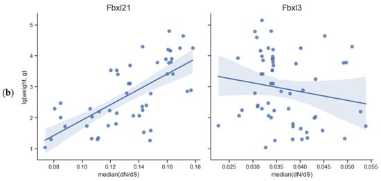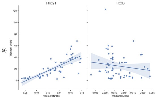 In the Fbxl21 and Fbxl3 genes from the Euarchontoglires superorder, for the species-specific maximal reported lifespan (MRLS) and the common logarithm of body weight, linear regressions (the lines with their estimated uncertainty) for the median and MRLS (a), as well as for the median and the common logarithm of body weight (b), are shown. Each dot represents an Fbxl21 or Fbxl3 gene from one animal species. The correlation between the considered species traits and the genomic characteristic—the median, which for Fbxl3 does not seem reliable enough due to the ambiguity of the regression line and small interval of change in the median, is shown.