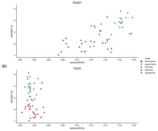 Scatter plots of the median and MRLS (a) and the common logarithm of body weight (b) for the Fbxl21 and Fbxl3 genes from the Euarchontoglires. Each dot represents an Fbxl21 or Fbxl3 gene from one animal species. The taxa are denoted by shape and color and are listed in the legend. The correlation between these species traits and the median is shown; see the description in Figure 2.