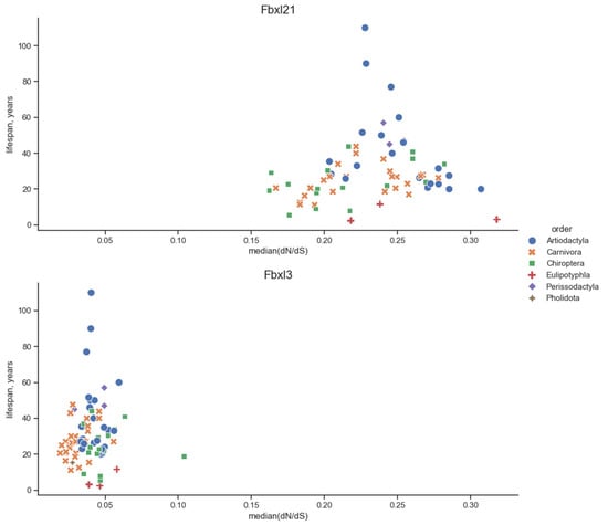 The lagomorphs do not follow the trend observed in Euarchontoglires: despite its MRLS and low body weight (the MRLS ranges between 7 and 18 years, and the body weight ranges between 100 g and 4.175 kg), lagomorph Fbxl21 is a pseudogene. Typically, lagomorphs mostly follow the r-strategy [,], characterized by short life cycles and high fertility rates. However, there has been plentiful evidence of the animals being twice both the size and MRLS, such as rabbits []. In modern habitats, longer MRLS or higher body weight in lagomorphs is likely not adaptive and is not under positive selection pressure. Therefore, the deviation described above might be related to population factors.