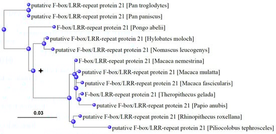 The protein tree of Fbxl21 in the anthropoid apes and Cercopithecidae (all species represented in RefSeq that have this protein). In the common chimpanzee and bonobo, the Fbxl21 protein sequences are identical. The node corresponding to the root of the phylogenetic tree is marked with a cross. The “0.03” above the bar represents the scale of the branch lengths, which corresponds to the expected number of substitutions per site. Specifically, a branch length of 0.03 indicates an expected 3% difference in amino acid sequence between the nodes connected by that branch. The peculiarity of Fbxl21 gene evolution in apes is shown.