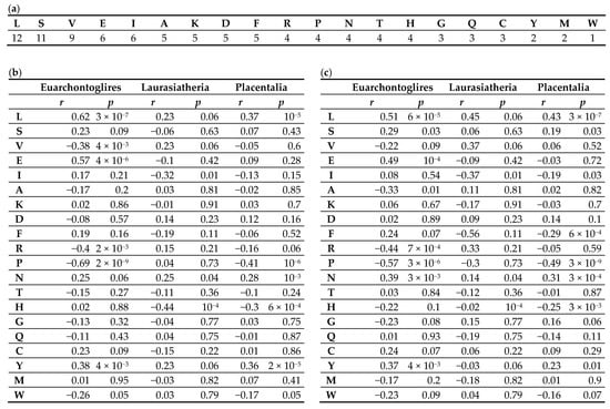 (a) The occurrence (%) of amino acids in the Fbxl21 protein, averaged by species. It is similar for Euarchontoglires, Laurasiatheria, and Placentalia. 20 amino acids are listed in the first row. (b) For the three superorders, Euarchontoglires, Laurasiatheria, and all placental mammals, the Pearson correlation coefficient r and the p-value of the amino acid occurrence in Fbxl21 with the species-specific lifespan are shown. (c) shows the common logarithm of the body weight; see (B) for a description. Correlation characteristics of the relationship between the frequency of each amino acid in the Fbxl21 protein in the indicated taxa and the species traits were obtained.