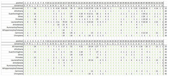 Only 12 positions of 54 positions in the domain fully match the consensus; and 12 and 8 more positions fully match the consensus in Euarchontoglires and Laurasiatheria, respectively. The latter positions almost never overlap with the former positions. Figure 7 shows the number of species from the taxon with residues that differ from the consensus, for each listed taxon. The last column shows the number of conservative positions in the consensus.