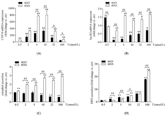As shown in Figure 2C (white columns), in 46XX cells, T induced a rising increase in estradiol concentration in comparison to untreated cells, by 1.2 ± 0.1-fold with T 0.5 nmol/L; by 1.9 ± 0.1-fold with T 2 nmol/L; 1.8 ± 0.2-fold with T 5 nmol/L; 2.7 ± 0.2-fold with T 10 nmol/L; 2.3 ± 0.1-fold with T 32 nmol/L; and 2.9 ± 0.1-fold with T 100 nmol/L (** p < 0.01 vs. untreated cell). Differently, in 46XY cells (Figure 2C black columns), we observed no significant effects of T at 0.5, 2, and 5 nmol/L, and a slight but significant decrease in estradiol release after T 10 (0.8 ± 0.0 vs. ctr, * p < 0.05), 32 (0.6 ± 0.0 vs. ctr, * p < 0.05), and 100 nmol/L (0.5 ± 0.0 vs. ctr, * p < 0.05). Concerning DHT secretion (Figure 2D), in comparison to untreated cells, we observed a significant increase in hormone release in both 46XX (1.3 ± 0.0-fold with T 0.5 nmol/L; 1.4 ± 0.0-fold with T 2 nmol/L; 1.7 ± 0.2-fold with T 5 nmol/L; 5.2 ± 0.1-fold with T 10 nmol/L; 6.5 ± 0.1-fold with T 32 nmol/L; and 25.0 ± 0.3-fold with T 100 nmol/L) and 46XY cells (1.2 ± 0.0-fold with T 0.5 nmol/L; 2.1 ± 0.1-fold with T 2 nmol/L; 3.6 ± 0.3-fold with T 5 nmol/L; 3.7 ± 0.5-fold with T 10 nmol/L; 6.0 ± 0.1-fold with T 32 nmol/L; and 17.2 ± 0.5-fold with T 100 nmol/L). Interestingly, we observed that, although at the lowest doses of 2 and 5 T nmol/L, in 46XY cells DHT release was significantly higher in comparison to 46XX, at the higher doses of 10 and 32 nmol/L, 46XX cells reached the same levels of DHT achieved by male cells and exceeded DHT levels of 46XY cells when exposed to T 100 nmol/L (Figure 2D).