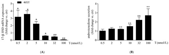 Finally, we observed a proportional increment of androstenedione release in 46XY cells with increasing T exposure (Figure 3B), by 1.2 ± 0.0-fold with T 5 nmol/L; 1.5 ± 0.2-fold with T 10 nmol/L; 2.2 ± 0.3-fold with T 32 nmol/L; and 2.7 ± 0.7-fold with T 100 nM.