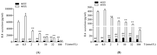 Finally, we analyzed the release of IL6 and IL8 myokines. As shown in Figure 4A,B, 46XX cells, at basal condition, showed a greater amount of both myokines in comparison to 46XY cells (respectively, for IL6, 396.4 ± 14.8 vs. 4.3 ± 0.3, ## p < 0.01; for IL8, 6027.2 ± 436.2 vs. 251.2 ± 13.9; ## p < 0.01). However, in 46XY cells, T induced a significant increase in IL6 secretion after 0.5, 2, 5, 10, 32, and 100 nmol/L of treatment (Figure 4A, black columns, and Table S1), and of IL8 after 10, 32, and 100 nmol/L of treatment (Figure 4B, black columns, and Table S1). Conversely, in 46XX cells, T tended to increase both IL6 and IL8 release at 0.5 nmol/L of treatment, whereas decreased myokines release after 2, 5, 10, 32, and 100 nmol/L of treatment (Figure 4A,B, white columns, and Table S1).