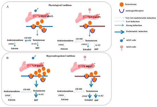 Unlike females, 46XY cells maintained an androgen environment subsequent to each dose of androgen stimulation, promoting DHT and androstenedione synthesis. In fact, from the lowest doses of T, we observed an increase in DHT secretion (Figure 2D) but no increment of estradiol secretion (Figure 2C). However, also in male cells, we observed an important upregulation in the expression of CYP-19 mRNA (Figure 2A) and a significant decrease in 5α-R2, inversely related to T concentration (Figure 2B). 5α-R2 is largely expressed in males [19] and probably right translated in its protein form. The observed DHT secretion probably translated correctly into its protein form. The observed DHT secretion probably relates to an enzyme amount already present in 46XY cells and then restored, with mRNA translation, with increasing doses of testosterone. Concerning CYP-19, we suggest that 46XY cells convert T to androstenedione (Figure 2A,B) and then possibly to estrone by the aromatase enzyme. Estrone is a weak estrogen agonist, and although, like other types of estrogen, it plays a role in female sexual function, it is not as powerful as other types of estrogen [53]. It is mainly produced after menopause by the adrenal glands and fatty tissue and behaves as a storehouse for estrogen, being converted into estrogen when needed. Estrone shows a low affinity for the estrogen receptor compared with estradiol [53], but earlier studies showed that when present in excess (ratio estrone/estradiol more than 4-fold) it can interfere with the ability of estradiol to bind its receptor, thus acting as an estrogen antagonist [54].