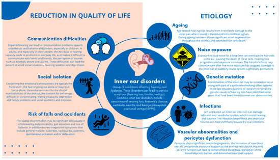The etiology of inner ear disorders is multifactorial, with factors such as aging, noise exposure, genetic mutations, infections, and vascular abnormalities contributing to their development [5,6,7,8] (Figure 1).