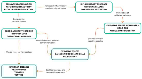 In the inner ear, inflammation has been implicated in various disorders, including autoimmune inner ear disease, labyrinthitis, and vestibular neuritis [126,127,128] (Figure 3). Inflammatory-mediated pericytes dysfunction can arise from various mechanisms, including oxidative stress, ischemia, hypoxia, and genetic mutations in inner ear disorders [129,130]. These mechanisms can lead to pericyte loss, detachment from the capillary wall, and impaired function, resulting in vascular abnormalities and compromised inner ear homeostasis [131]. Oxidative stress occurs when there is an imbalance between the production of reactive oxygen species (ROS) and the ability of cells to detoxify them or repair the resulting damage [132,133] (Figure 3).