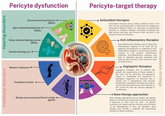 However, pericyte dysfunction can have profound implications for various pathological conditions such as neurodegenerative diseases, diabetic retinopathy, and tumor angiogenesis [23,24,25]. In the context of inner ear disorders, impaired pericyte function can lead to compromised blood flow, disruption of the blood–labyrinth barrier, and diminished neuronal support [22]. These consequences contribute significantly to the development and progression of inner ear pathological conditions as observed in inflammation, Meniere’s disease, genetic hearing loss, and age or loud-sound related impairment of mouse cochlea, emphasizing the importance of pericyte function in maintaining inner ear health [15,22,26,27,28]. This comprehensive review aims to provide an in-depth overview of the role of pericytes in inner ear disorders focusing on the distribution and function of pericytes in the cochlear and vestibular microvasculature, and the mechanisms by which pericyte dysfunction may contribute to various inner ear disorders. Furthermore, we explore potential pericyte-targeted therapies and discuss current research and future directions in this field.