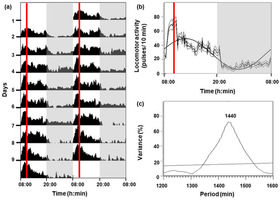 Locomotor activity of goldfish for 9 days. (a) The actogram is represented as double-plotted (48 h time scale) for better visualization. (b) Average waveform: mean (bold black line), standard deviation (gray lines), and periodic sinusoidal function wave. The white areas correspond to the light phase (08:00–20:00 h) and the shaded areas correspond to the dark phase (20:00–08:00 h). The red vertical lines indicate the feeding time (10:00 h). (c) The periodogram represents the % variance versus time. The horizontal line reflects the significance threshold (p < 0.05) and the number above the observed peak indicates the value of the period in minutes.