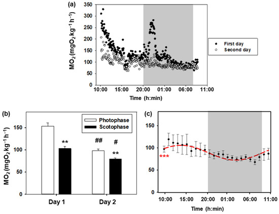 Daily oxygen consumption of goldfish. (a) The 24 h profile of the metabolic rate of 8 goldfish during the first day (black dots) and the second day (white dots). The white areas correspond to the light phase (08:00–20:00 h), while the shaded areas correspond to the dark phase (20:00–08:00 h). (b) Oxygen consumption during photophase and scotophase on days 1 and 2. Data are represented as mean + S.E.M. (n = 8). Two-way ANOVA, Holm–Sidak test: ** p < 0.001 for photophase versus scotophase on the same day; # p < 0.05; ## p < 0.001 for the same phase of the day comparing days 1 and 2. (c) Metabolic rate (mean ± S.E.M.) of C. auratus on the second day (data are grouped by hours). As the Cosinor analysis yielded significant results (Zero amplitude test: *** p < 0.001), the sinusoidal periodic function is represented as a red curve.