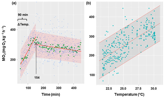 Effect of temperature increase on metabolic rate in C. auratus. (a) The blue points represent the raw data of 8 fish at each time, the green points correspond to the mean of these fish at each time, and the red line represents the fit of the data to a lineal regression. The arrow indicates the time at which the linearity break occurs (154 min). (b) The relationship between temperature and oxygen consumption during the first phase (154 min), with the raw data (blue) of 8 fish at each temperature represented with their fitted values (red). Shaded regions correspond to 95% confidence intervals.