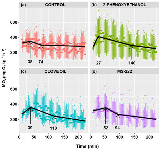 Figure 6 shows the metabolic rate profiles of anesthetized and non-anesthetized goldfish. A similar profile is observed in all cases, characterized by a positive slope in oxygen consumption, followed by an inflection point at which the maximum is achieved and the slope becomes negative. The maximum was reached at 38 min in the control group, at 27 min in the 2-phenoxyethanol group, at 39 min in the clove oil group, and at 52 min in the MS-222 group, although there were no statistically significant differences.
