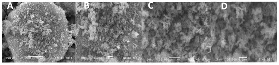 SEM image of CuO NPs at a magnification of ×5000 (A), ×10,000 (B), ×20,000 (C) and ×30,000 (D).