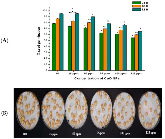 According to the findings of our study, seedlings grown when treated with CuO NPs showed altered development as compared to seedlings grown from untreated plants. The germination and development of seedlings at lower NP concentrations may be because of increased uptake and imbibition of oxygen and water, which may have accelerated the action of protease and amylase enzymes, amino acids, and soluble sugars that are needed for the germination and development of seedlings. Higher concentrations, on the other hand, could have caused particle agglomeration, which could have hampered oxygen and water uptake and hence influenced germination [45].